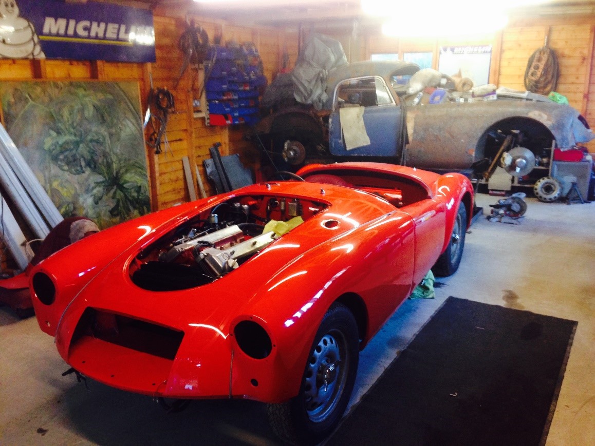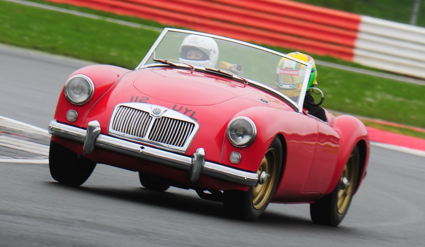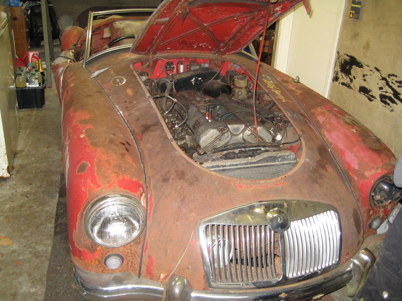 1958 MGA Twin Cam roadster. Orient red with red interior and black roof.