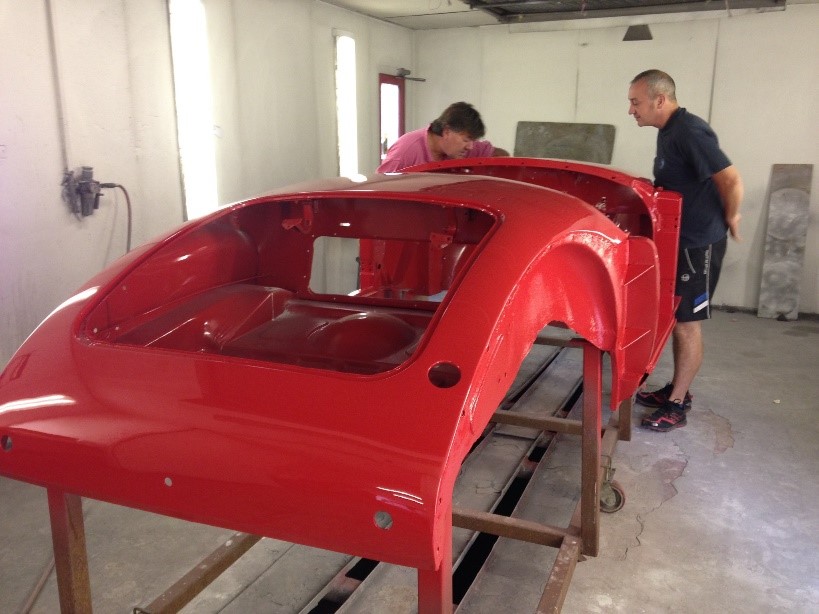 The body tub had to have some welding and repairs before it could be sent away for paint. As a final check for fit, the body was lowered onto the completed chassis to check everything was in the correct alignment before finally being removed and placed onto a specialist jig for paint.